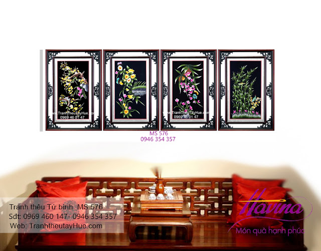 Tranh thêu tứ bình được khách đến cửa hàng tranh thêu tay tphcm chọn mua để treo phòng khách chuẩn bị đón năm mới 2020